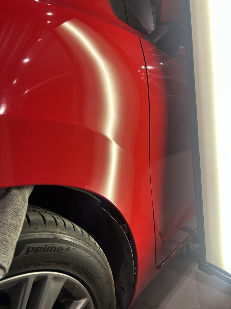 助手席側フロントフェンダーのヘコミ依頼とボディ磨き&コーティングをいただきました